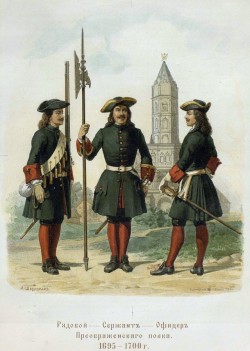 Преображенцев и семеновцев разделили на роты, у них появились свои знамена, сержанты и унифицированная форма. Темно-зеленая у первых, и синяя — у вторых. Первые полки создавались, скорее всего, по подобию гвардии Людовика XIV.